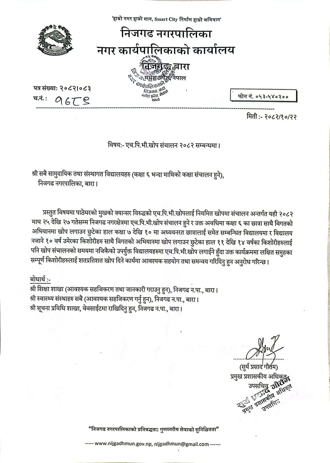 एच.पि.भी.खोप सञ्चालन २०८२ सम्बन्धमा।