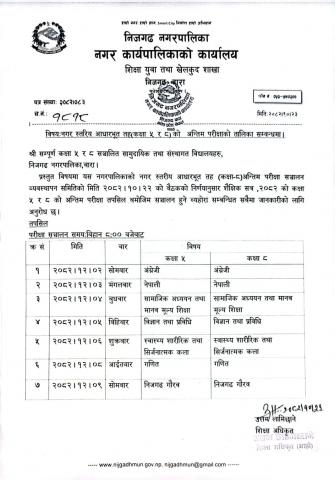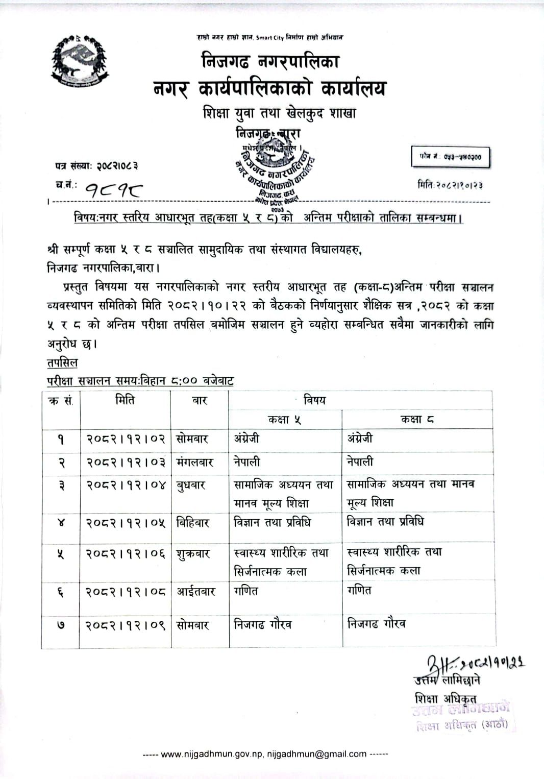 नगर स्तरिय आधारभूत तह (कक्षा ५ र ८) को अन्तिम परिक्षा को तालिका सम्बन्धमा।