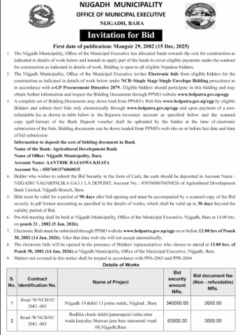 निजगढ नगरपालिकाको आ.व.२०८२/०८३ को Ncell सडक कालोपत्रे निरन्तरता वडा न १२ र अल्पसंख्यक माझी र दलितहरुको बस्ती निर्माण वडा न ४ कार्यको विधुतीय बोलपत्र आह्वान सम्बन्धी सूचना ।