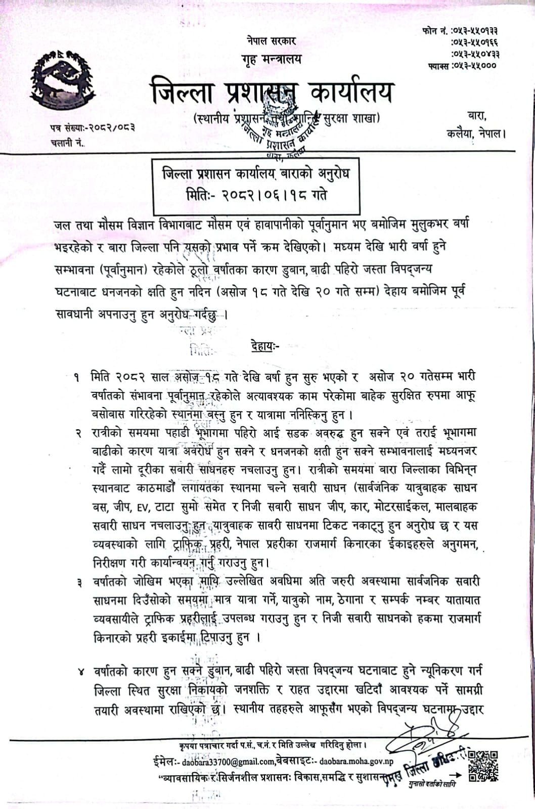 जिल्ला प्रशासन कार्यालय बाराको, अनुरोध। मितिः २०८२।०६।१८