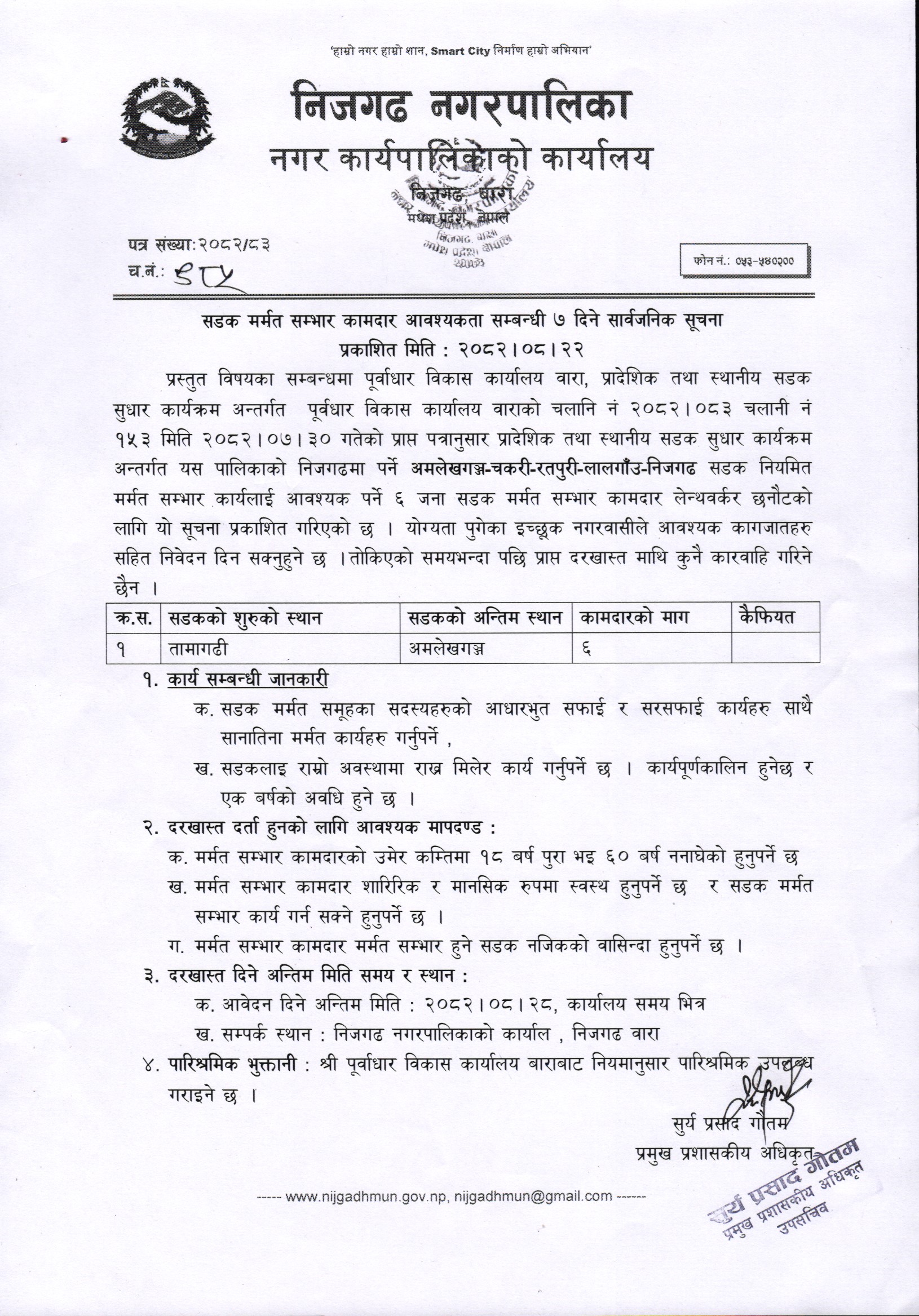 » सडक मर्मत सम्भार कामदार आवश्यकता सम्बन्धी ७ दिने सार्वजनिक सूचना।