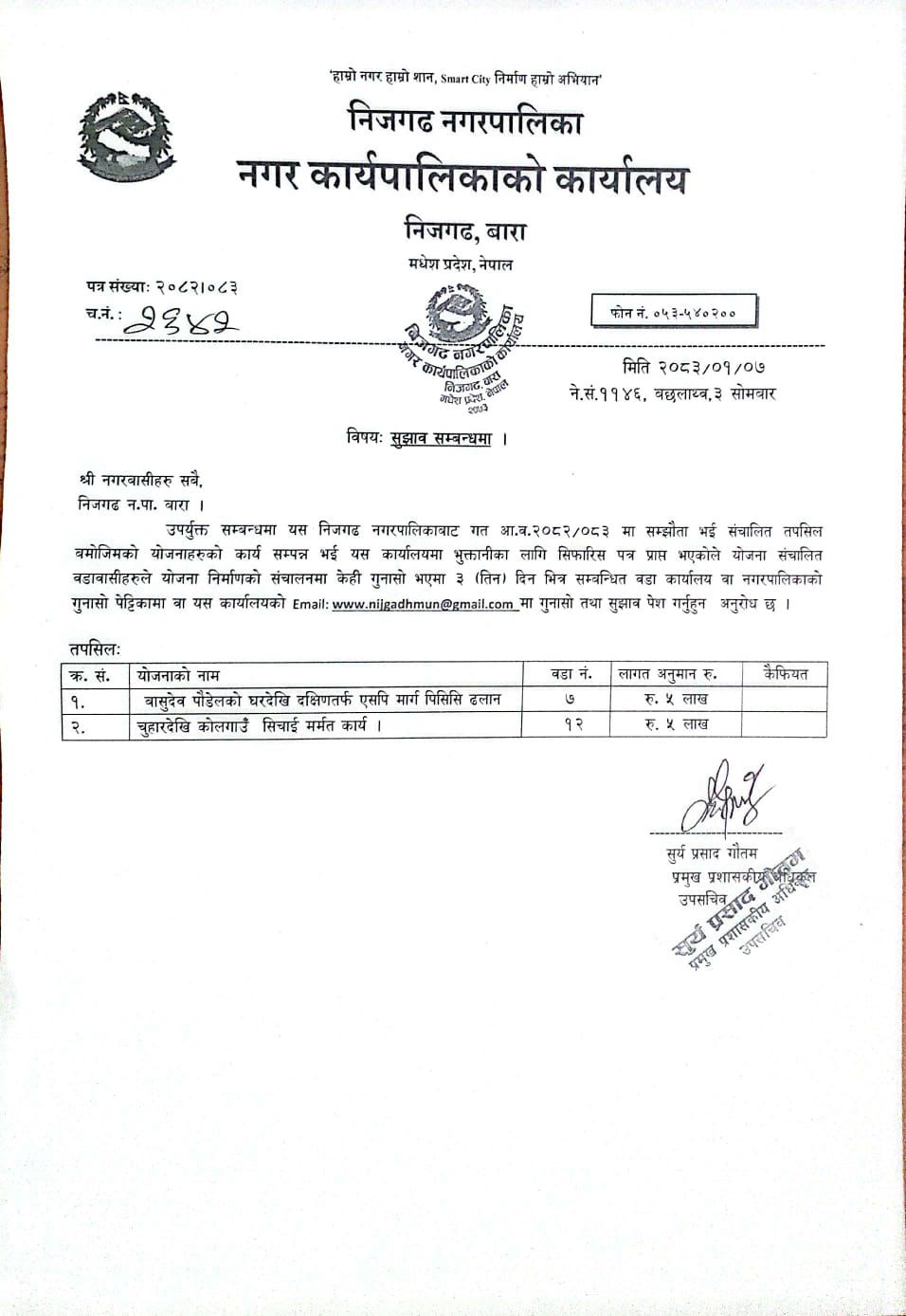 निजगढ नगरपालिकाको आ.व.२०८२/०८३ को विभिन्न कार्यको विधुतीय बोलपत्र आह्वान सम्बन्धी सूचना ।
