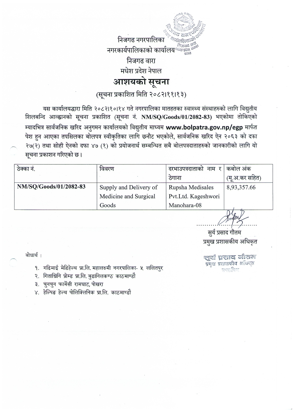 निजगढ नगरपालिकाको आ.व.२०८२/०८३ को औषधि खरिद सम्बन्धी सिलबन्दी दरभाउ पत्र आव्हान गरिएको सम्बन्धी सूचना।