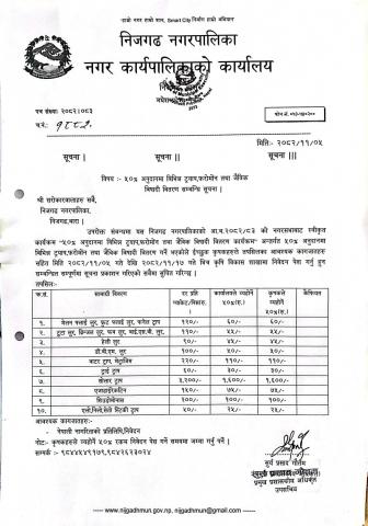 निजगढ नगरपालिकाको आ.व.२०८२/०८३ को स्थानीय उत्पादन संकलन तथा बिक्री केन्द्र स्थापना वडा नं ५ कार्यको विधुतीय बोलपत्र आह्वान सम्बन्धी सूचना ।