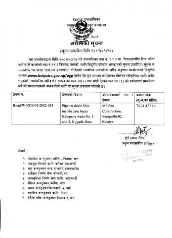 निजगढ नगरपालिकाको आ.व.२०८२/०८३ को वडा नं १ र ३ को पिपलटार देखि शिव मन्दिर जाने बाटो मा कालोपत्रे कार्यको विधुतीय बोलपत्र आह्वान सम्बन्धी सूचना ।