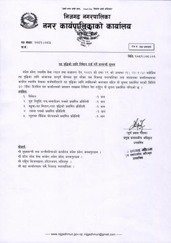 निजगढ नगरपालिकाको कार्यालयको कम्प्युटर सेट प्रिन्टर, स्क्यानर र फोटोकपी मिसिन आपूर्ति सम्बन्धी शिलबन्दी दरभाउपत्र आह्रानको सूचना।