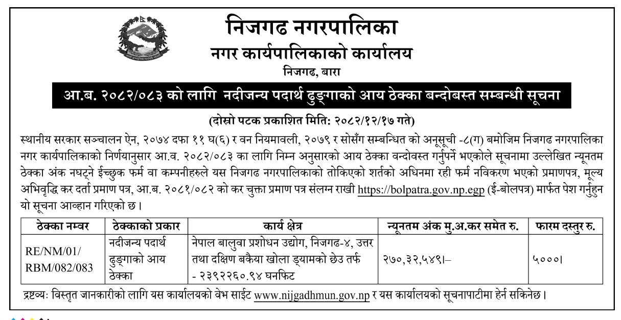 निजगढ नगरपालिकाको आ.व.२०८२/०८३ को विभिन्न कार्यको विधुतीय बोलपत्र आह्वान सम्बन्धी सूचना ।