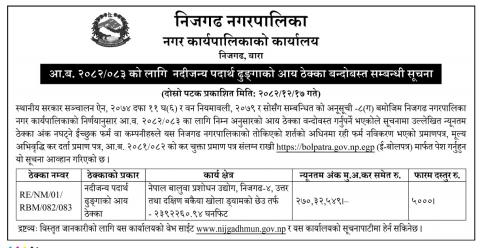 नदीजन्य पदार्थ ढुङ्गाको आय ठेक्का बन्दोबस्त सम्बन्धी सूचना।