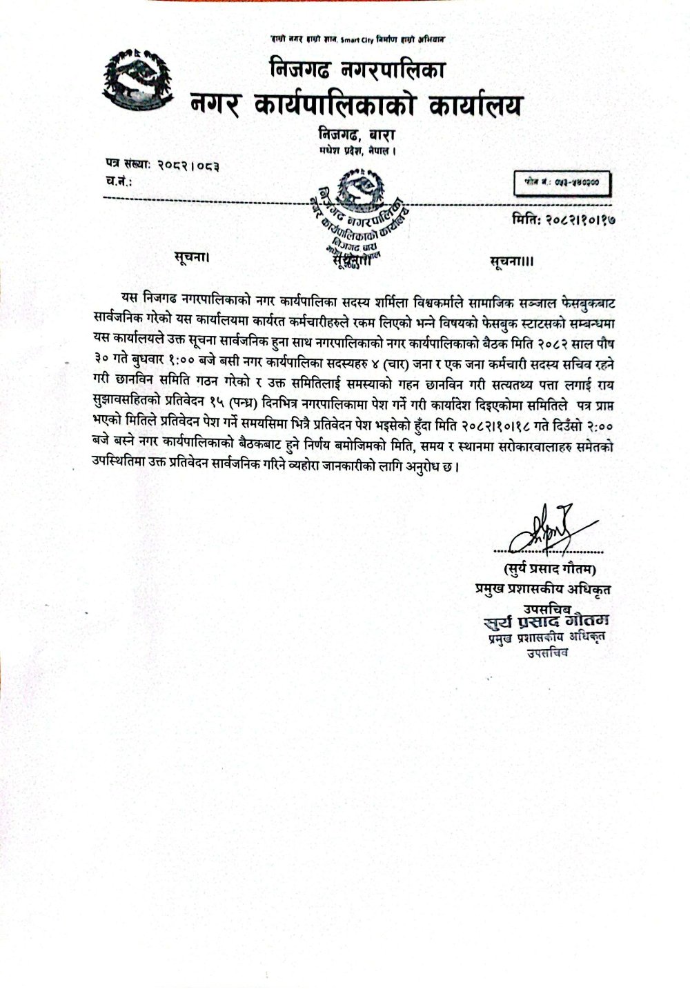 निजगढ नगरपालिकाको आ.व.२०८२/०८३ को विभिन्न कार्यको विधुतीय बोलपत्र आह्वान सम्बन्धी सूचना ।