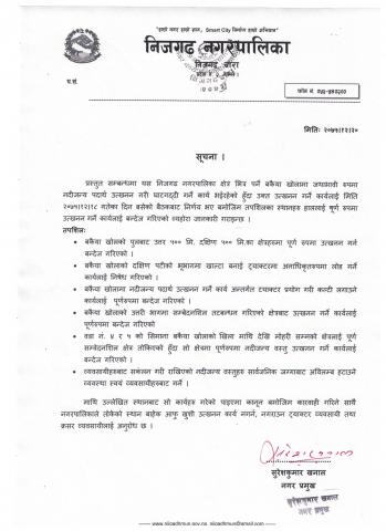 निजगढ नगरपालिकाको कार्यालयको झ्याल, ढोका निर्माण तथा मर्मत सम्बन्धी शिलबन्दी दरभाउपत्र आह्रानको सूचना।